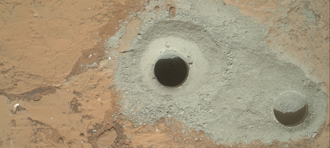 For the first time, the Curiosity Rover, using its robotic arm, has drilled a whole and collected a sample of Martian Bedrock. The whole, measuring about 0.63 inch (1.6 centimeters) wide and 2.5 inches (6.4 centimeters), according to the NASA website, can be seen in images sent back to earth from Curiosity. The rock powder collected by the rover should help in determining the long gone, wet environment of Mars. John Grunsfeld, NASA associate administrator for the agency’s Science Mission Directorate said, “The most advanced planetary robot ever designed is now a fully operating analytical laboratory on Mars.” He continued, “This is the biggest milestone accomplishment for the Curiosity team since the sky-crane landing last August, another proud day for America.” Following the collection of the samples, NASA scientists must now tell the rover to process the samples by apportioning them to the instruments inside. While it seems like a fairly straightforward process, measures have to be taken before analyzing the powder. For example, according to Scott McCloskey, drill systems engineer from NASA’s Jet Propulsion Laboratory in Pasadena, California, some of the rock dust “will be used to scour traces of material that may have been deposited onto the hardware while the rover was still on Earth, despite thorough cleaning before launch.” NASA scientists must ensure there is no contamination which would skew the results. “We’ll take the powder we acquired and swish it around to scrub the internal surfaces of the drill bit assembly. Then we’ll use the arm to transfer the powder out of the drill into the scoop, which will be our first chance to see the acquired sample.” Once the sample is set, it will be placed over a sieve that will screen out any particles that are larger than six-thousandths of an inch (150 microns) across. Those tiny particles will then fall in to the “Chemistry and Mineralogy (CheMin) instrument” and the “Sample Analysis at Mars (SAM) instrument.” These instruments will then begin the much-anticipated detailed analysis. What Curiosity is accomplishing on the red planet is nothing short of miraculous. The distance from Earth to Mars can be a far as 249 million miles (401 million km). It demonstrates that despite much controversy and skepticism surrounding NASA recently, the US remains at the forefront of interplanetary exploration.