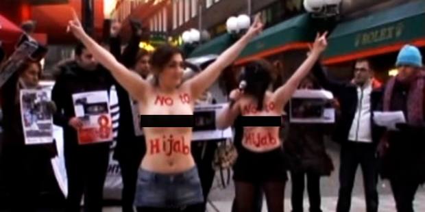 Female Iranian protesters in Stockholm, shed their tops in protesting against the symbolically and physically restrictive Hijab. Never mind that they’re self proscribed Communists, whatever that means in 2013, they are making an extremely valid and legitimate point. I suppose Communism could be considered the opposite of Religious Fanaticism. They are also believed to be part of FEMEN, the Ukrainian women’s group known for using nudity in its demonstrations. The organization posted photos of the Iranian women’s topless protest on its website in a show of solidarity. Women need to stand up for themselves when it comes to their bodies. Whether in protest of the hijab or abortion rights. Why are men allowed to beat women who are not covered head to toe in ridiculous garments or have control over women’s reproductive rights? Why should men be allowed to restrict women from driving, working or from becoming educated? Religion, as it relates to helping those in need and for self-healing is fine. But when religion is used to oppress women, it serves no purpose. In Stockholm, the women protesting used phrases such as “my nudity is my protest” and “No to Sharia law. Human rights, freedom, and equality”. These women are making an excellent and directed point, as nothing is more disrespectful to these so-called “men” who espouse the subjugation of women. Women’s breasts are only for their pleasure when they’re ready to use them. Women’s bodies “belong” to them. The United States of America must therefore vote in a female President. Make these closed-minded religious fanatics deal with a woman holding the most powerful position on the face of the earth. What a statement that would make. Finally, the United States must stop dealing with countries that don’t believe in the equality of all people. That’s how we can demonstrate our greatness. By not pointing out the injustices, we are condoning such behavior. Politics aside, Right is Right!! And we must always stand for and strive for, “LIberty And Justice For All.”
